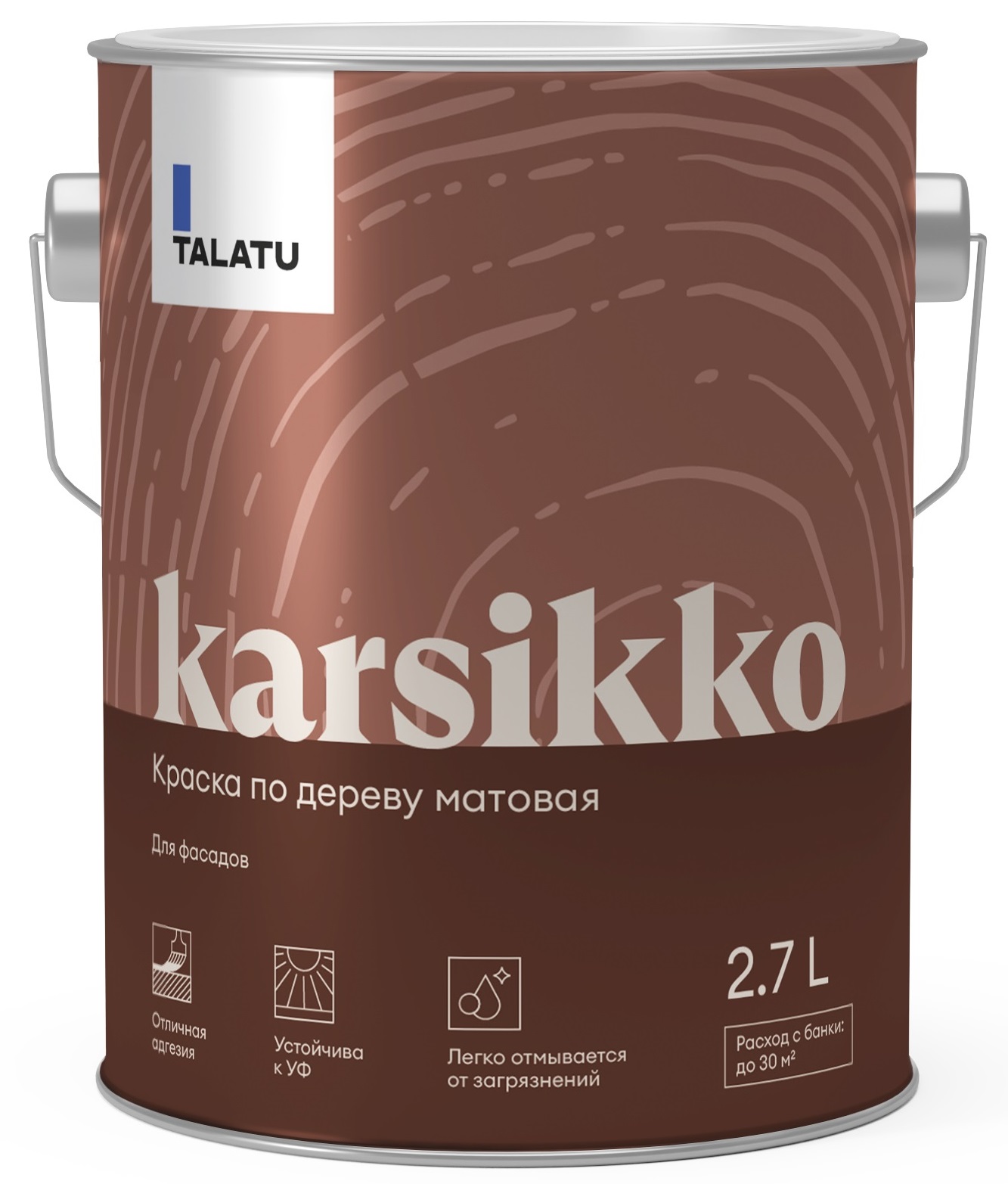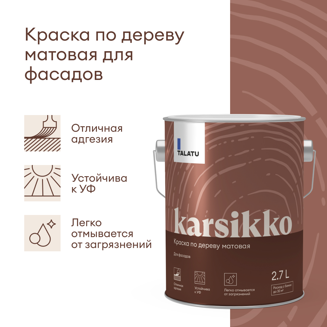 Водно-дисперсионная полиакриловая матовая краска для деревянных фасадов Talatu KARSIKKO предназначена для окрашивания фасадов из всех видов обшивочных досок, вагонки, имитации бруса, блок-хауса, планкена.