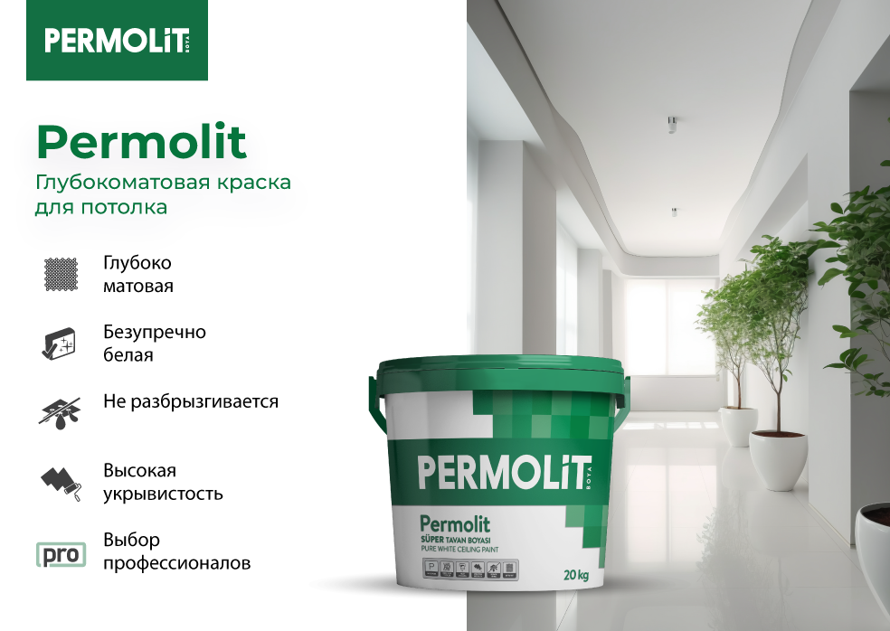 Потолочная краска PERMOLIT легко наносится, полностью скрывает дефекты поверхности, показывая высокую степень белизны и декоративного эффекта. Распределяется равномерным слоем без потеков и следов валика. Относится к профессиональным продуктам.