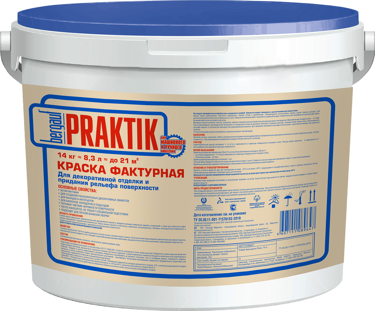 Работать в СИЗ (перчатки, очки, респиратор) в хорошо проветриваемом помещении. Состав Полиакриловая дисперсия, пигменты, наполнители, добавки, вода.