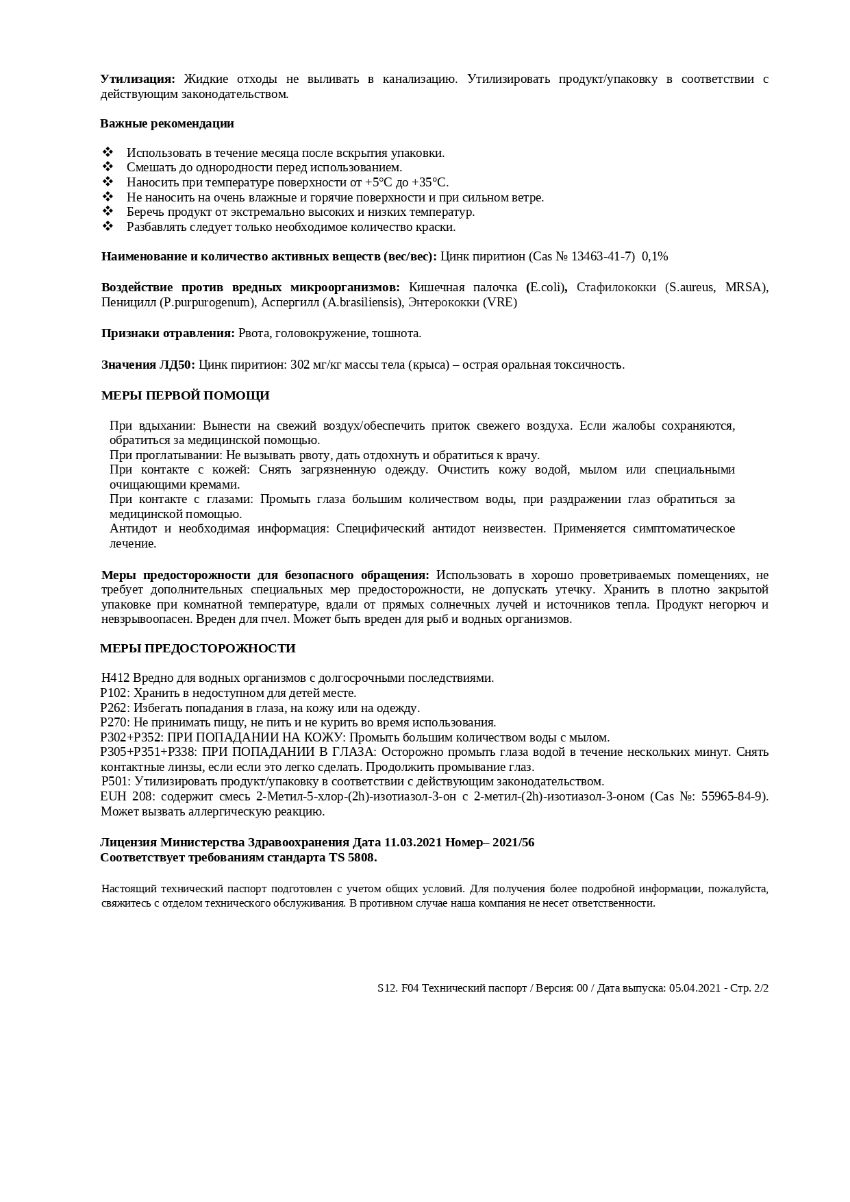 Хранение: срок хранения 3 года с даты изготовления в заводской невскрытой упаковке, в прохладном сухом месте, защищенном от прямых солнечных лучей и замерзания. Продукт пожаро- и взрывобезопасен.