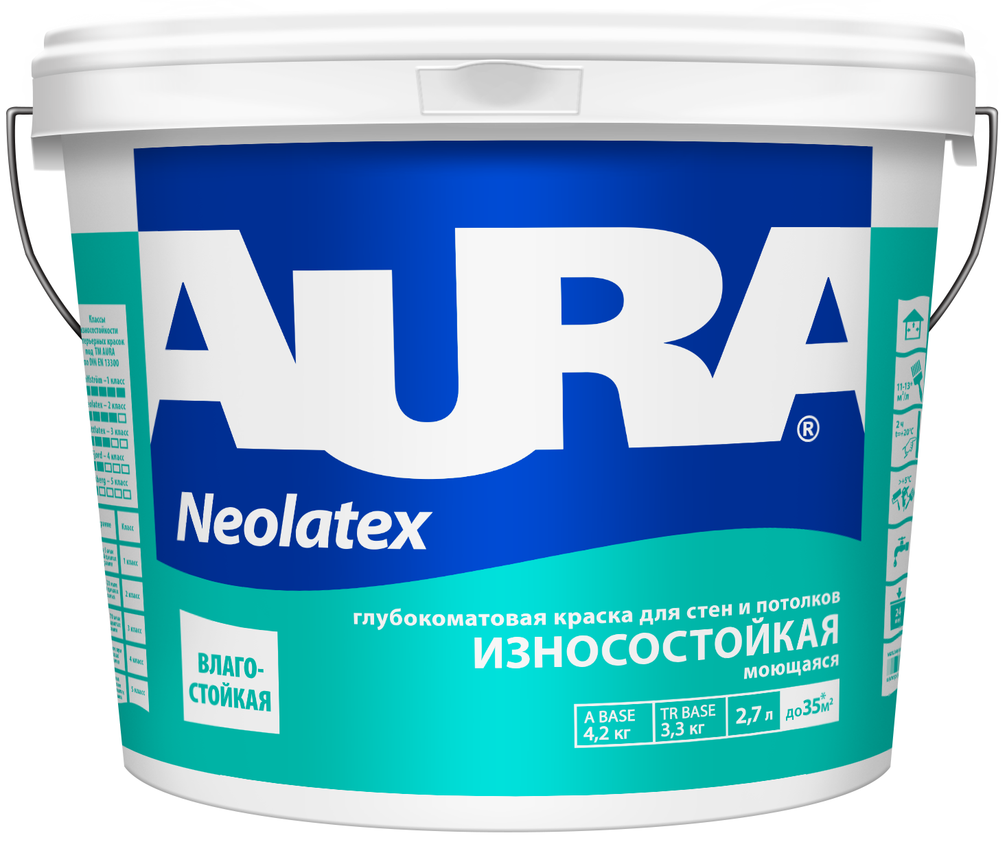Износостойкая краска Aura Interior Neolatex – это глубоко матовая водно-дисперсионная краска для стен и потолков в помещениях с нормальной и повышенной влажностью, а также для поверхностей, требующих регулярного мытья с применением бытовых неабразивных моющих средств (стены в административных и офисных помещениях и пр.).