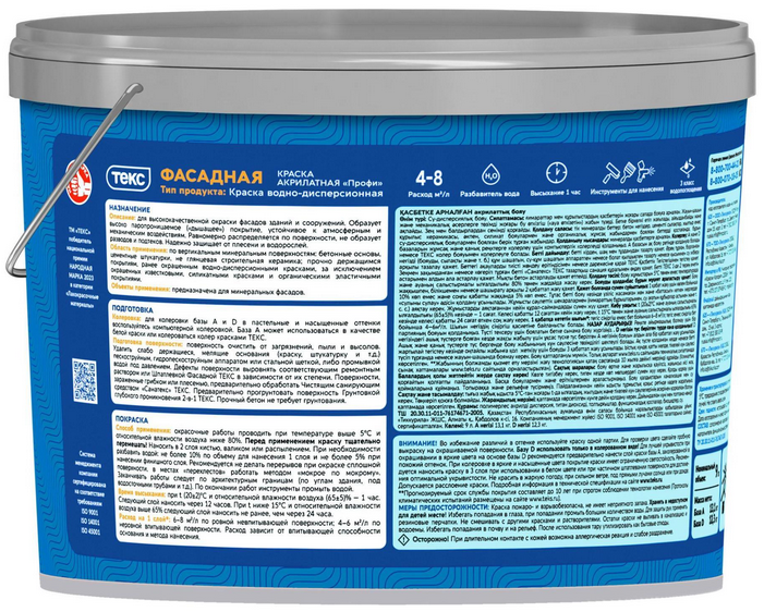 Краска водно-дисперсионная фасадная Текс Профи 9л- акрилатная краска, которая предназначена для окраски фасадов зданий и сооружений по минеральным поверхностям (бетонные основы, цементные штукатурки, не глянцевая строительная керамика, глиняный кирпич), прочно держащимся покрытиям, ранее окрашенным водно – дисперсионными красками. Может колероваться машинным способом