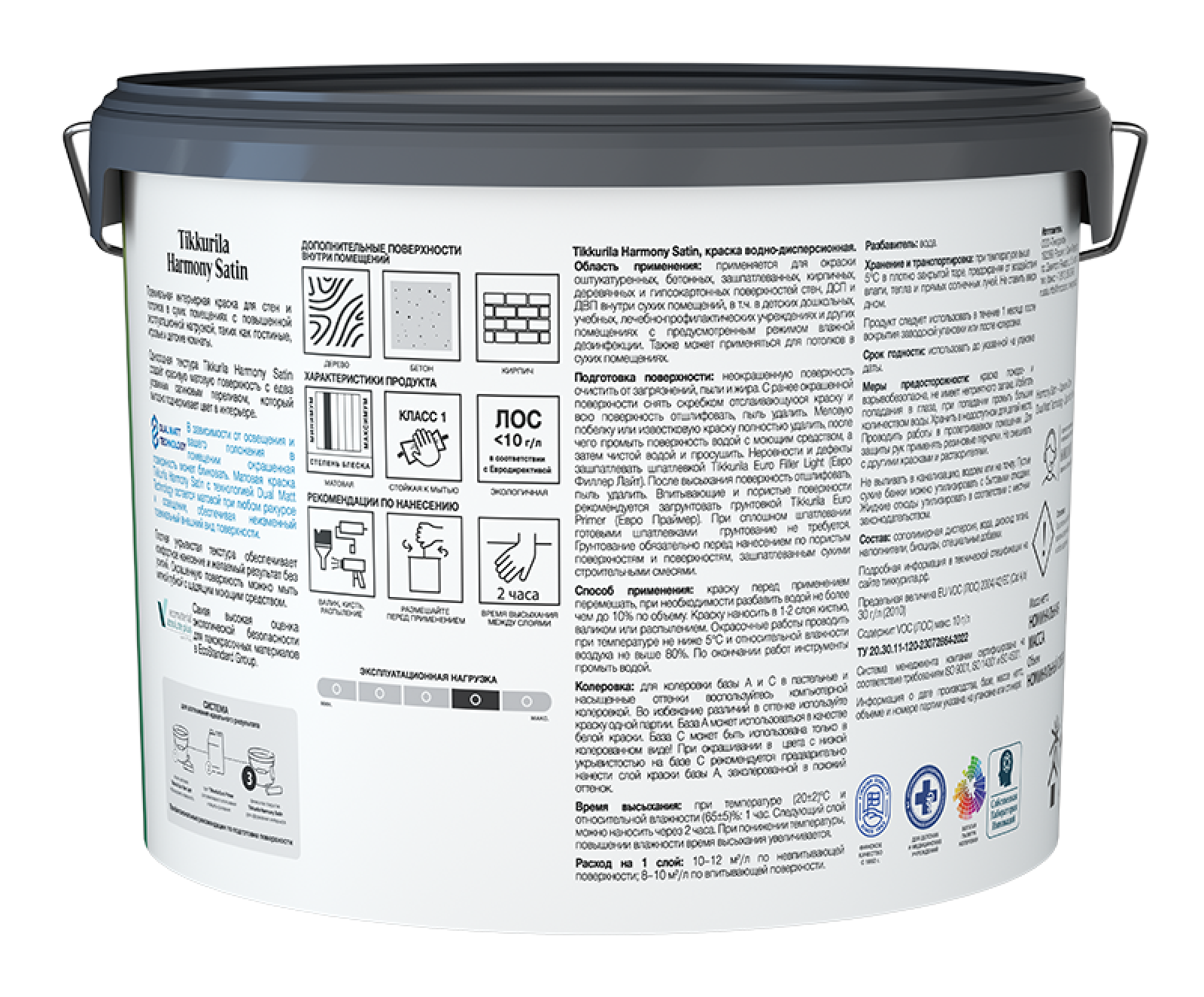 Колеровка: Колеруется согласно каталогам «Тиккурила Симфония» в светлые пастельные тона, а также может самостоятельно использоваться как белая краска.