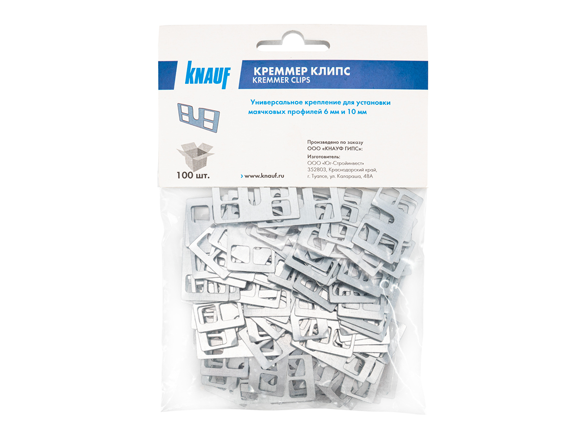 Кнауф Креммер Клипс – универсальное крепёжное приспособление из оцинкованной стали для штукатурных (маячковых) профилей. Используется для фиксации штукатурных профилей к саморезам.