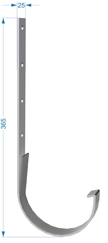 Металлический кронштейн (крюк желоба) предназначен для крепления желоба на кровлях без лобовой доски. Крепится на стропильную систему, всегда устанавливается до монтажа кровли. Длина опорной части кронштейна - 300 мм.