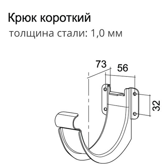 Кронштейн (крюк) желоба короткий - это элемент водосточной системы, предназначенный для фиксации водосточного желоба. Устанавливается на лобовую доску как до, так и после монтажа кровельного покрытия с шагом не более 500мм. Обязательно крюки устанавливаются на торцах желоба, в местах соединения желобов между собой и с углами желоба.