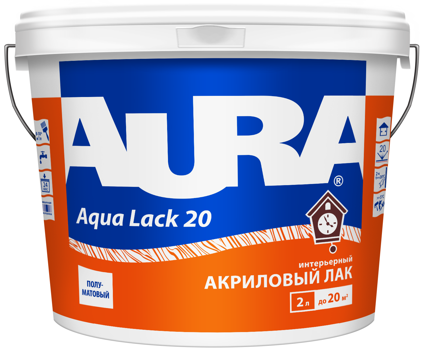 Лак интерьерный Aura Aqua Lack 20 2л- Интерьерный акриловый водоразбавимый лак для отделки минеральных поверхностей, например, бетонных, кирпичных, оштукатуренных, каменных и т.д., деревянных поверхностей, например, стеновые и потолочные панели, бревна, брусья, ДВП, ДСП и т.д., а также поверхностей, ранее окрашенных или оклеенных обоями.
