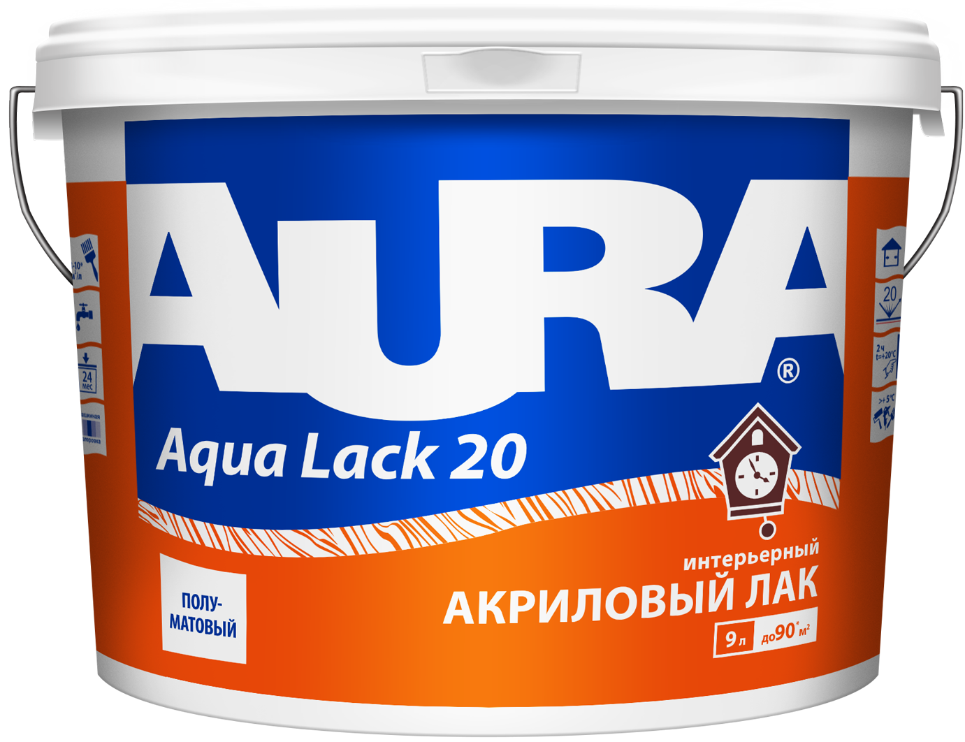 Лак интерьерный Aura Aqua Lack 20 9л - Интерьерный акриловый водоразбавимый лак для отделки минеральных поверхностей, например, бетонных, кирпичных, оштукатуренных, каменных и т.д., деревянных поверхностей, например, стеновые и потолочные панели, бревна, брусья, ДВП, ДСП и т.д., а также поверхностей, ранее окрашенных или оклеенных обоями.