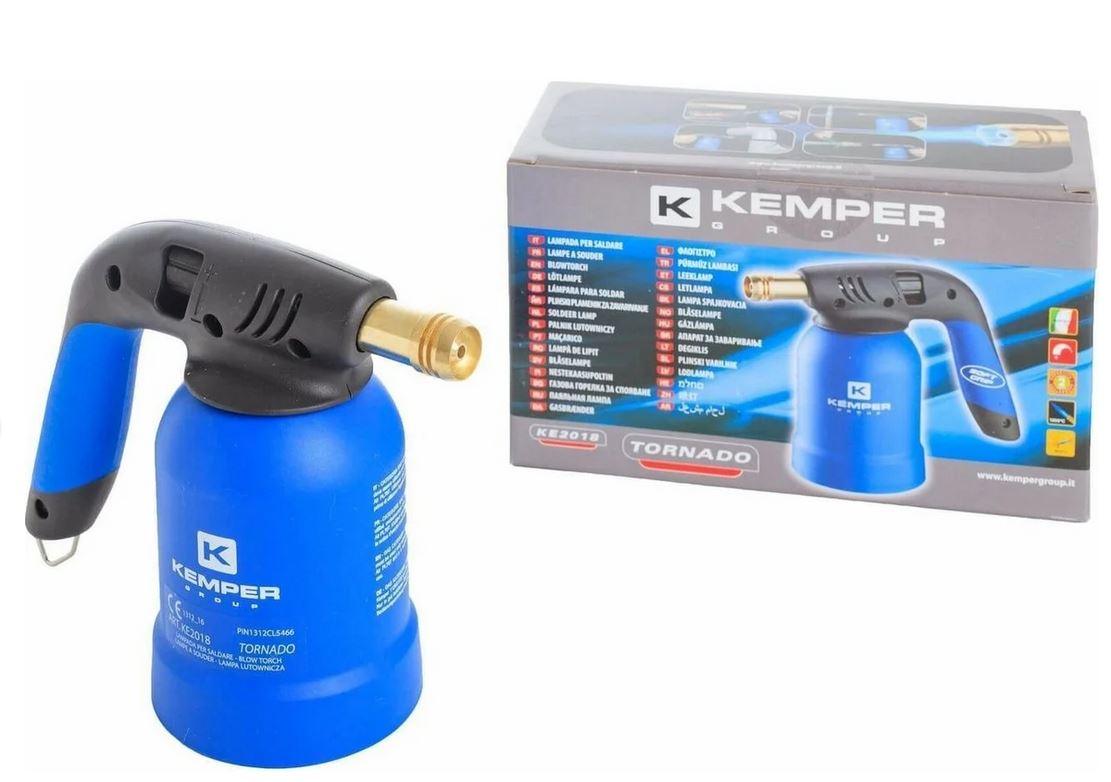 Паяльная лампа Кемпер 2018 с традиционным воспламенением. Имеет корпус из термостойкого пластика под прокалываемые газовые баллоны, удобную прорезиненную ручку, регулятор пламени и запатентованную систему безопасности, которая предохраняет от несвоевременного отсоединения газового баллона.
