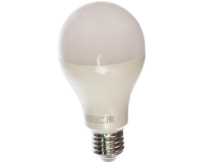 Светодиодная лампочка с цоколем E27 и размерами 134 мм по высоте и диаметром в 67 мм обладает мощностью в 25 W, благодаря чему она может осветить 8.3 кв. м. Цветовая температура – 4500 К, т.е. белый свет, подходящий для рабочего настроя (не рекомендуется для детской комнаты). Изделие рассчитано на использование в сети с переменным напряжением в 170-265В.