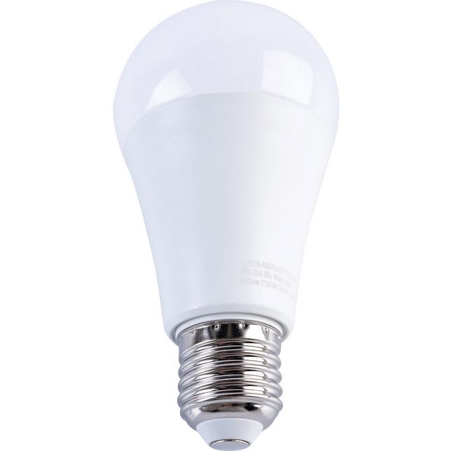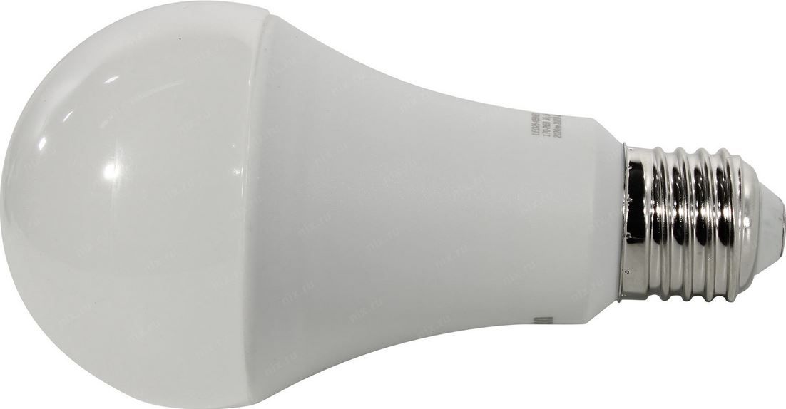 Светодиодная лампочка с цоколем E27 и размерами 120 мм по высоте и диаметром в 60 мм обладает мощностью в 15 W, благодаря чему она может осветить 5 кв. м. Цветовая температура – 4500 К, т.е. белый свет, подходящий для рабочего настроя (не рекомендуется для детской комнаты). Изделие рассчитано на использование в сети с переменным напряжением в 170-265В.
