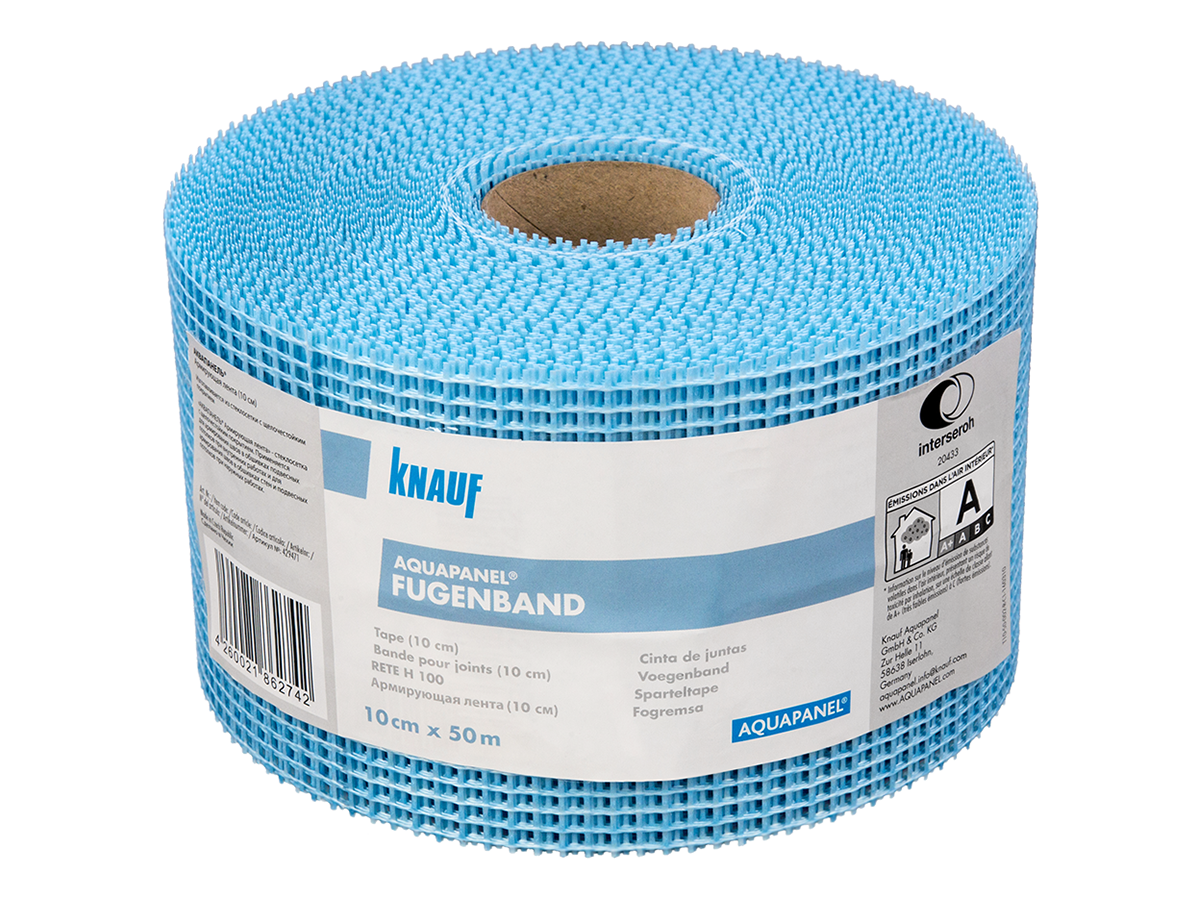 Лента для швов АКВАПАНЕЛЬ – лента из стеклоткани в форме рулона шириной 10см, предназначена для армирования стыков Аквапанелей Кнауф различных видов. Используется совместно со шпаклевочной смесью, приклеивается смесью к поверхности плиты. Намотка рулона 50м.
