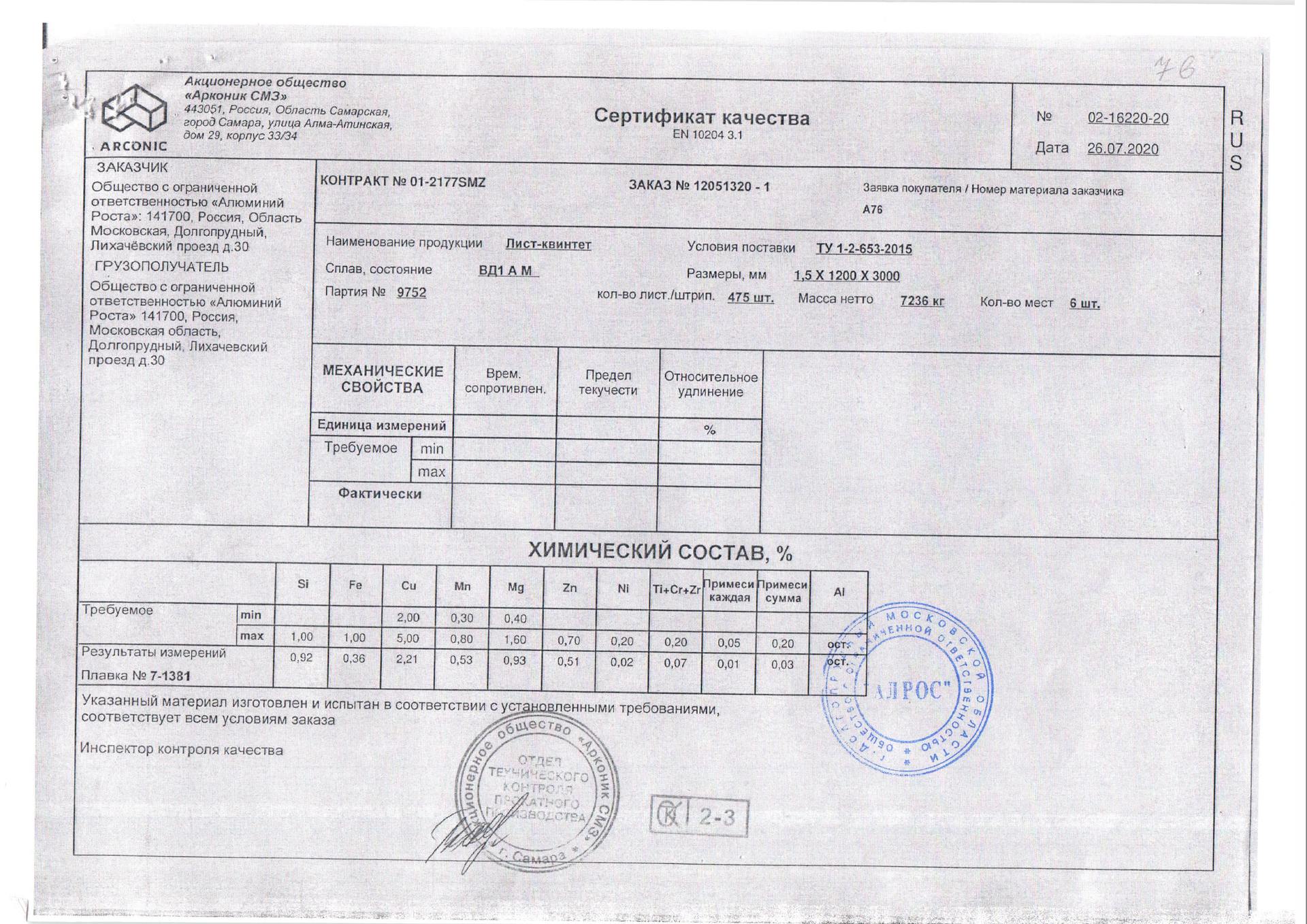 Лист алюминиевый рифлёный Квинтет 1,5 х 600 х 1200мм