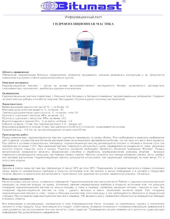 Гидроизоляционная битумная мастика Битумаст - это полностью готовый к применению продукт, на основе нефтяного битума, содержащий профессиональные технологические добавки и растворитель.