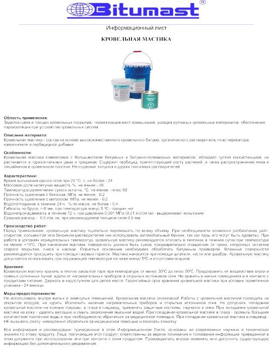 Кровельная мастика Битумаст – это полностью готовый к применению продукт на основе нефтяного битума, содержащий гербицидную добавку, технологические добавки и растворитель.