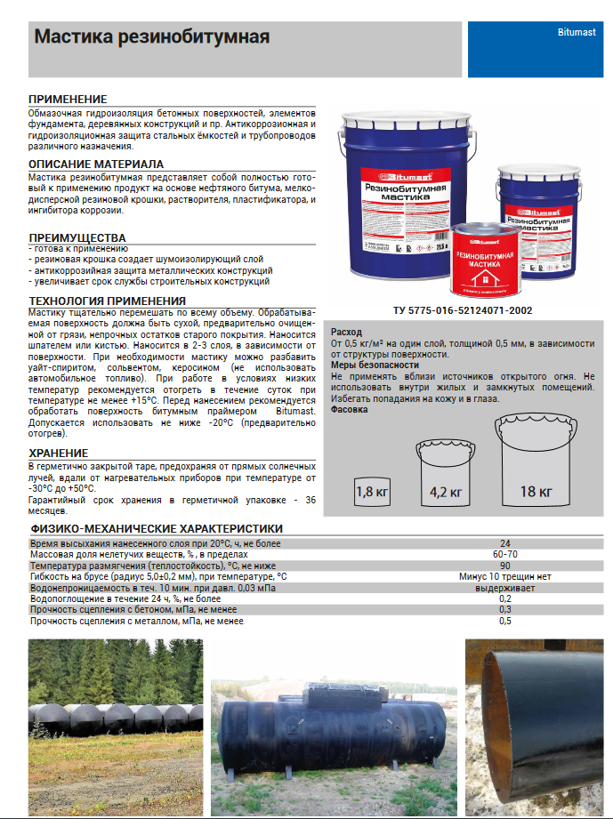 Резинобитумная мастика применяется как обмазочная гидроизоляция бетонных поверхностей, элементов фундамента, деревянных конструкций и пр. , а также как антикоррозионная и гидроизоляционная защита стальных ёмкостей и трубопроводов различного назначения.