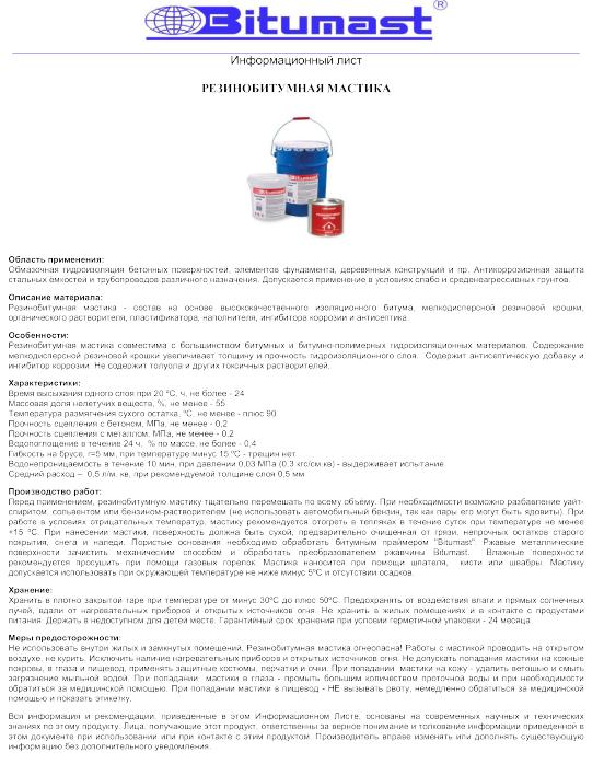Резинобитумная мастика Битумаст – это полностью готовый к применению продукт на основе нефтяного битума, мелко-дисперсной резиновой крошки, растворителя, пластификатора и ингибитора коррозии.