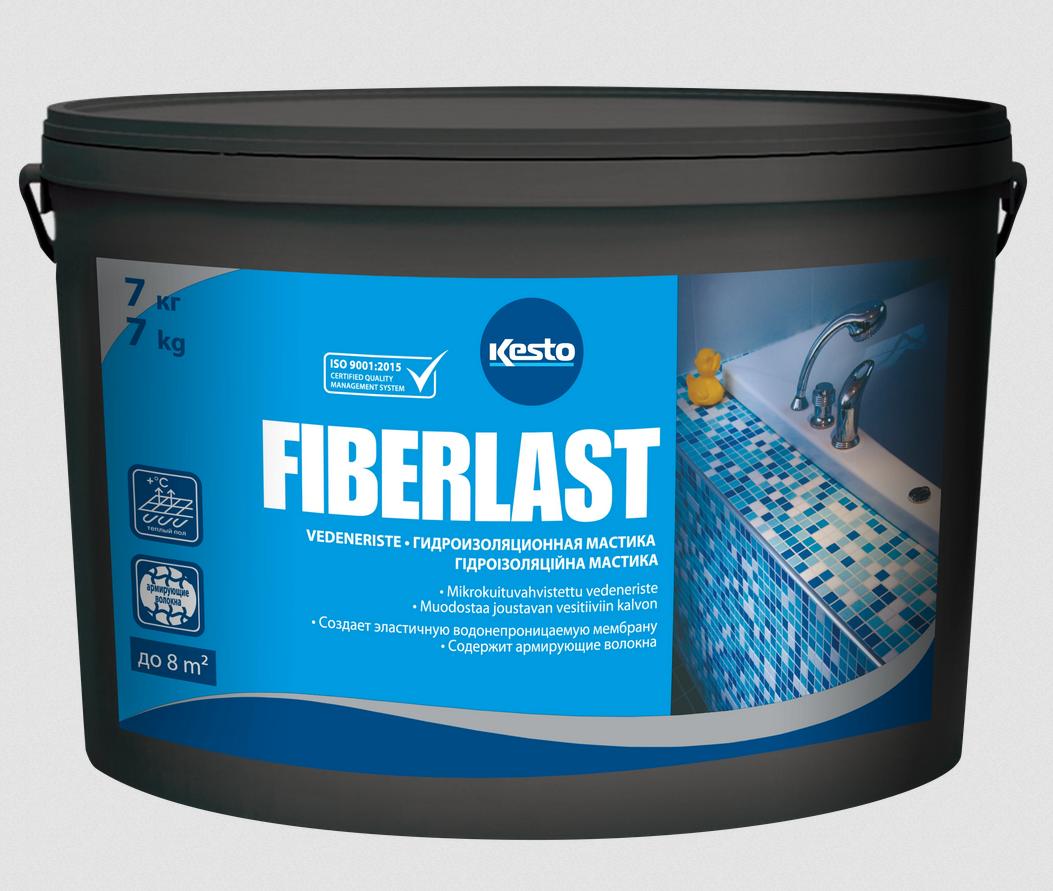 Kesto Fiberlast - гидроизоляционная мастика с содержанием армирующих волокон для гидроизоляции стен и полов во влажных и мокрых помещениях. Не применяется на объектах, постоянно подвергаемых нагрузке водой (например, бассейны) и для поверхностей, температура которых превышает +60 °С (например, стены саун).