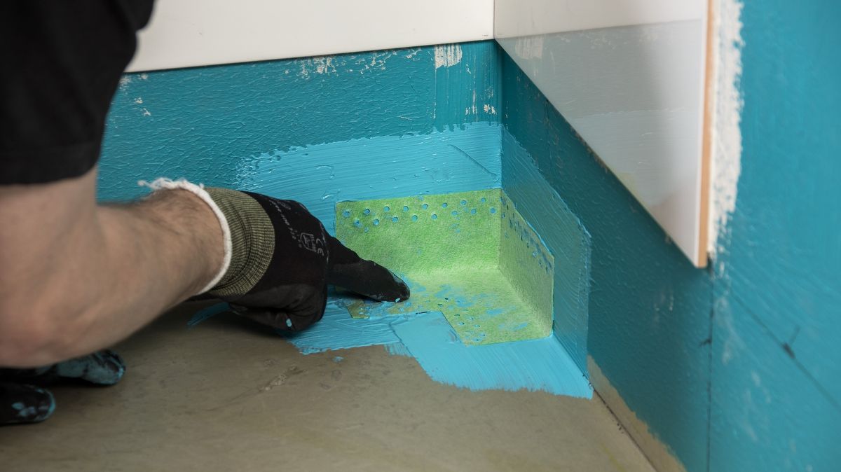 Нанести мастику Fiberlast на углы, стыки поверхностей основания, головки винтов, места выходов водопроводных труб и другие подвижные части конструкции, сквозные отверстия и вокруг сантехнического трапа. На эти места прикрепите ленту для упрочнения углов Kesto. Для сточного отверстия используйте два куска, отрезанных от ленты для упрочнения углов Kesto, укладывая их перпендикулярно один на другой. Приложите куски ленты к свежему слою мастики Fiberlast и убедитесь в том, что она полностью пропиталась.