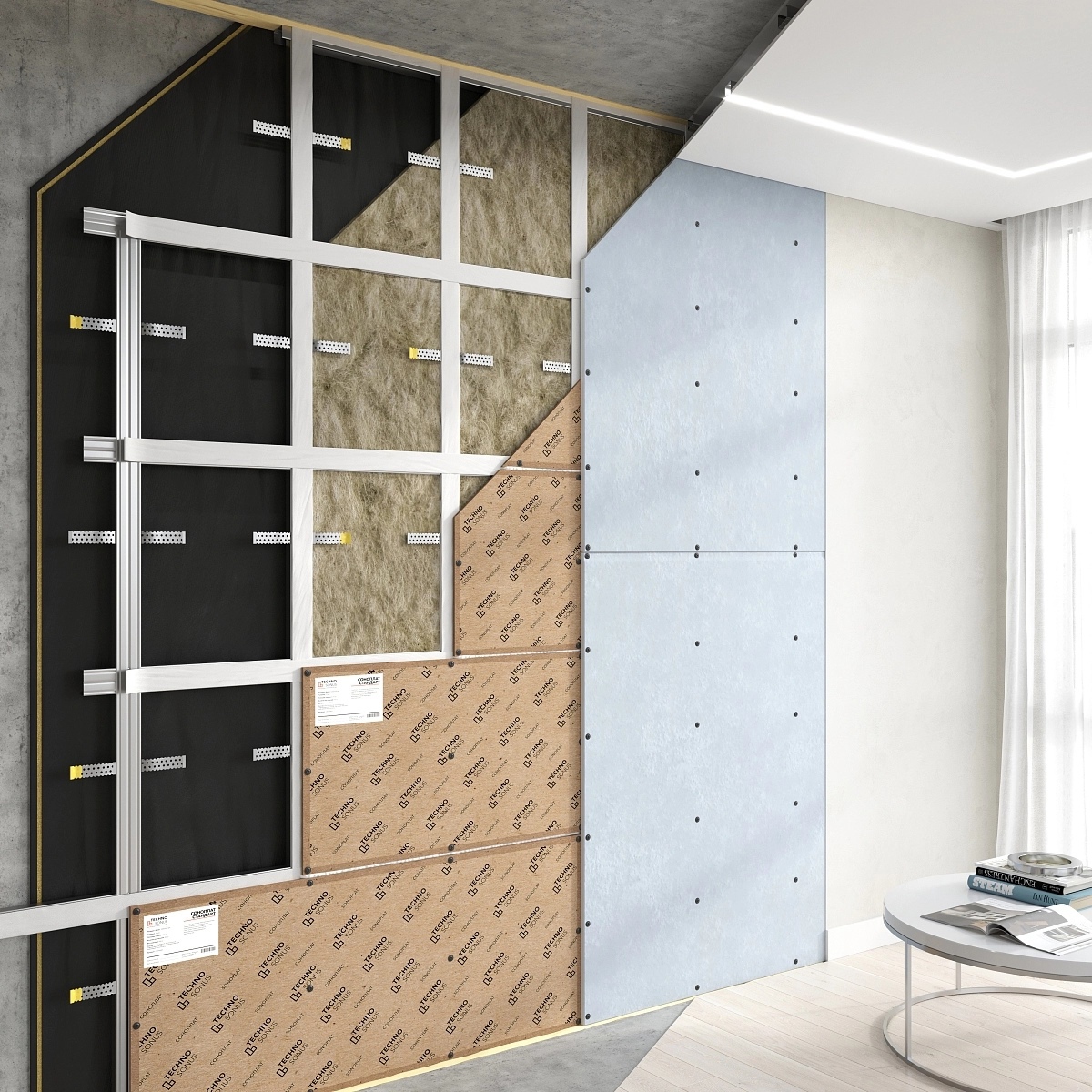 Улучшает шумоизоляцию при минимальной толщине системы.