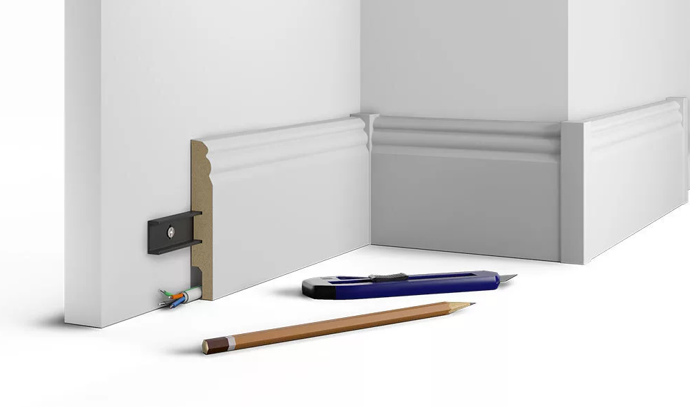 Монтажная планка предназначена для простого монтажа напольных плинтусов МДФ. Возможен многократный монтаж и демонтаж плинтуса.