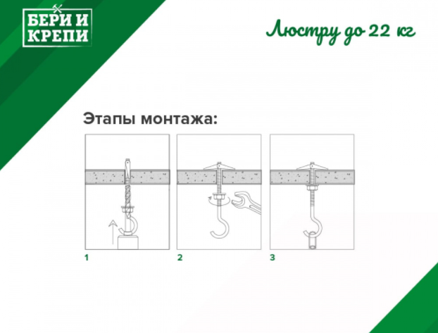 Набор для крепления люстры до 22 кг. В наборе есть все, что вам потребуется для выполнения этой задачи быстро и комфортно.