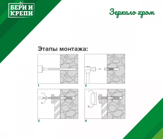 Какой замечательный комплект крепежа для зеркала! Не надо всё искать и подбирать отдельно, тут уже всё есть. Действительно, как и сказано: "Бери и Крепи".