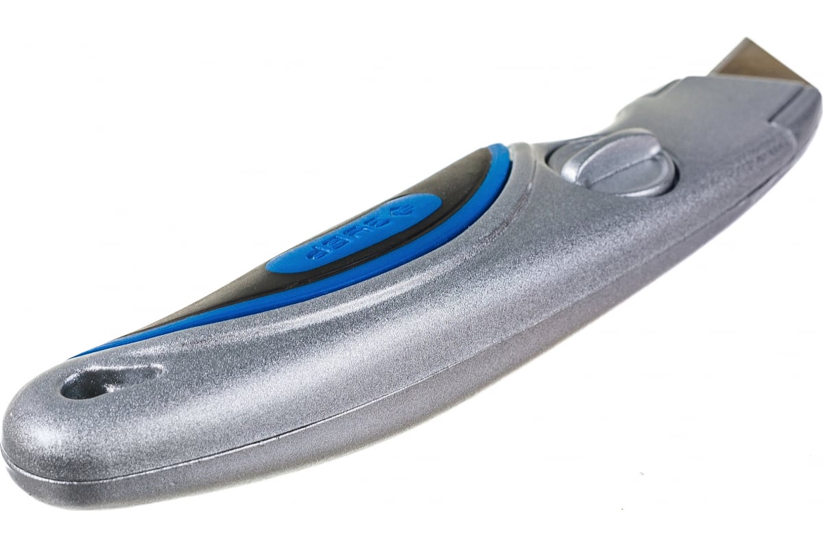 Замена лезвия осуществляется с помощью ролика-фиксатора, без использования доп. инструмента. Благодаря обрезиненному корпусу нож не скользит в руке.