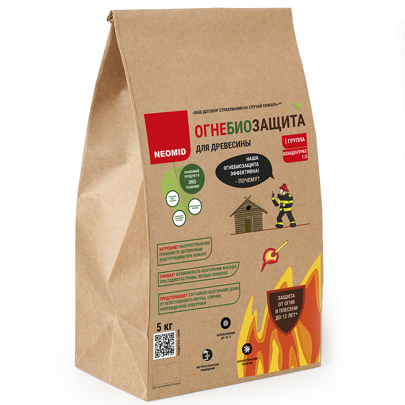 Огнебиозащита Неомид сухой концентрат предназначена для комплексной защиты древесины и изделий на основе древесины, в том числе для обработки деревянных стен, балок, стропильных систем, несущих брусьев, перекрытий, лаг, оконных и дверных блоков, а также других конструкций из древесины в жилых, производственных, административных, общеобразовательных, детских дошкольных и других типов зданий. Обработка продуктом обеспечивает материал трудновоспламеняемыми свойствами, затрудняет распространение пламени по поверхности, тем самым облегчая пожаротушение, защищает от воздействия бактерий, дереворазрушающих и деревоокрашивающих плесневых грибов, водорослей, мхов и лишайников. Возможна обработка деревянных конструкций, эксплуатируемых в районах с высокой влажностью воздуха. Не образовывает пленку на поверхности. Огнебиозащита Неомид обеспечивает I группу огнезащитной эффективности согласно ГОСТ Р 53292 Расход: