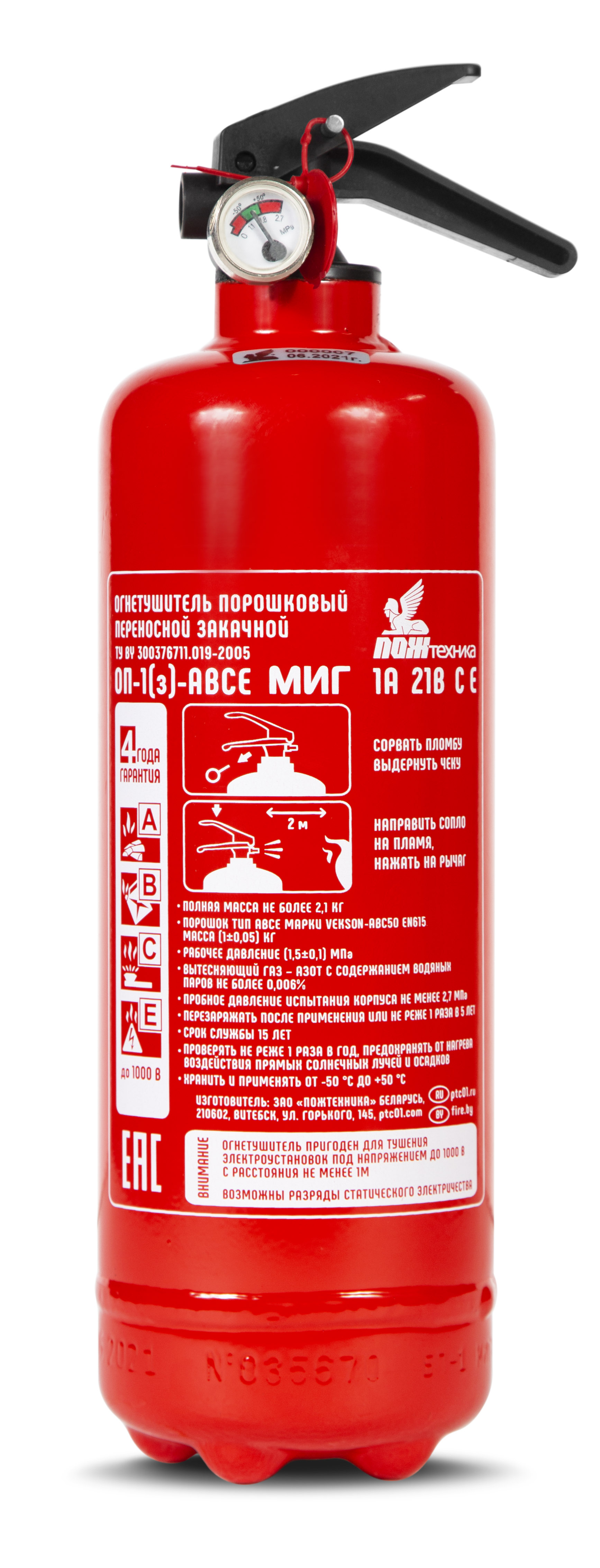 Огнетушитель ОП-1 МИГ - Порошковый огнетушитель, заряжаются высококачественным огнетушащим порошком «Вексон АВС-25». Это самый признанный и востребованный порошок для зарядки огнетушителей в странах СНГ, который применяется во всех климатических зонах при температуре окружающей среды от минус 50 до плюс 50 С.