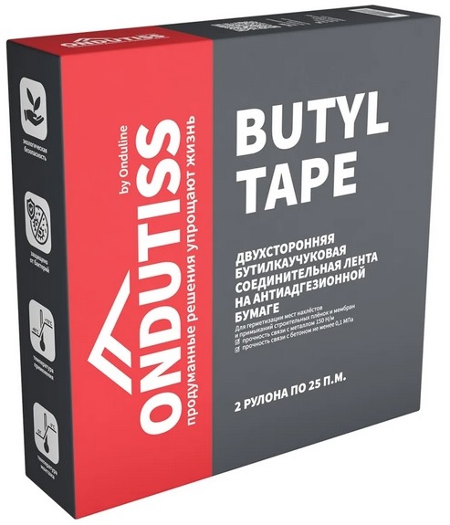 Ондутис Butyl Tape представляет собой двустороннюю самоклеющуюся монтажную, ленту изготовленную из бутилкаучука, на антиадгезионной (не липкой) бумаге, которая служит не только основой для ленты, но и является защитным слоем, не позволяющим ей повреждаться и преждевременно высыхать.