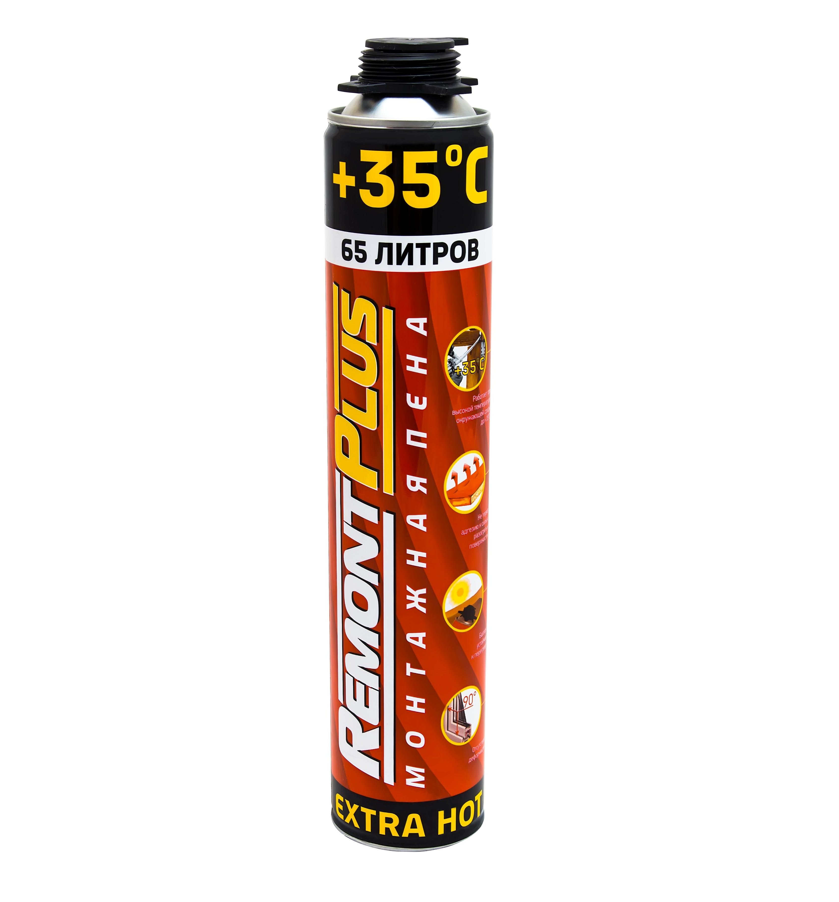 Пена монтажная Remont Plus 65 Extra Hot Pro - профессиональная монтажная пена с закрытыми порами, затвердевающая до полуэластичного состояния под воздействием влажности воздуха.