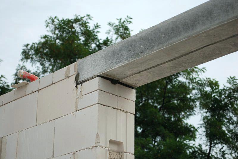 Укладка перемычек производится когда высота стены достигла высоты проёма. Монтаж малогабаритных перемычек осуществляется вручную, крупногабаритные устанавливают при помощи грузоподъёмной техники. Затем продолжается укладка кирпича или газобетонных блоков.