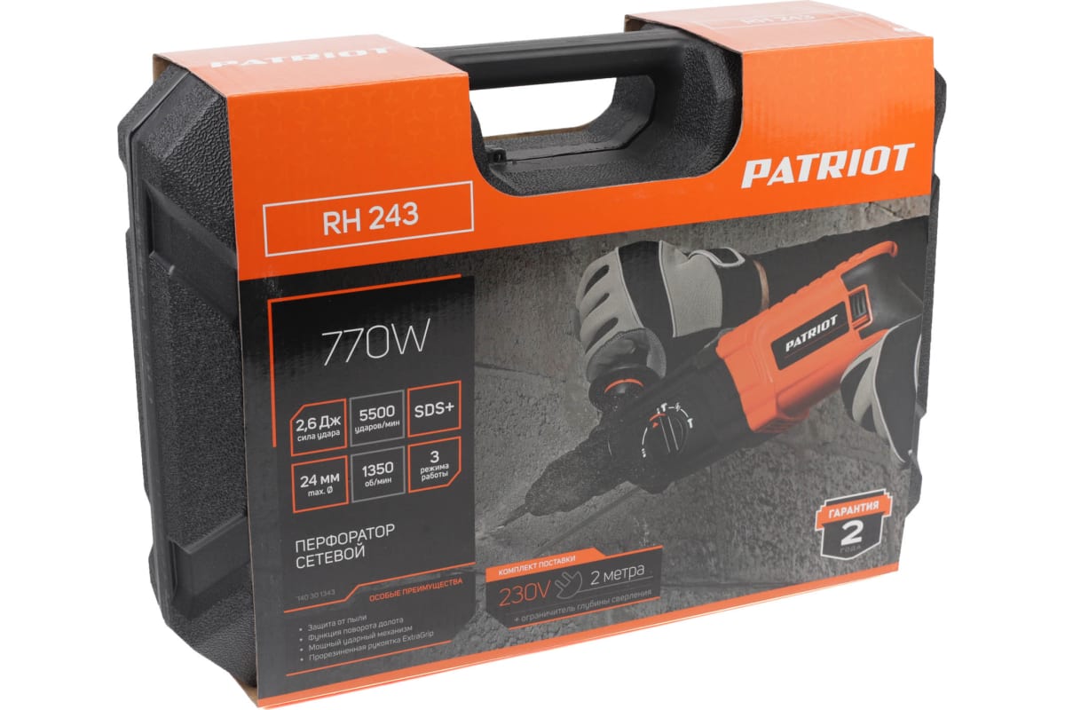 Перфоратор PATRIOT RH 243 отлично подойдет для бытовых, строительных и ремонтных работ по дому. Инструмент сочетает в себе оптимальные характеристики со взвешенной ценой. Перфоратор многофункционален благодаря наличию трех режимов работы: сверления, сверления с ударом, а также ударного долбления. Дополнительно есть функция поворота долота в необходимое положение для штробления. В режиме удара инструмент может использоваться с зубилом и конопаткой для работ по кафелю или штукатурке. Для бетона и кирпича предусмотрен режим «сверления с ударом» при использовании буров и зубил. Режим сверление позволяет делать отверстия в металле, древесине и т.д. Крепление оснастки производится на патрон SDS-плюс, что повышает скорость замены инструмента. Повышенная сила удара 2.6 Дж дает возможность эффективно использовать эту модель в качестве отбойного молотка. Преимущества данной модели: