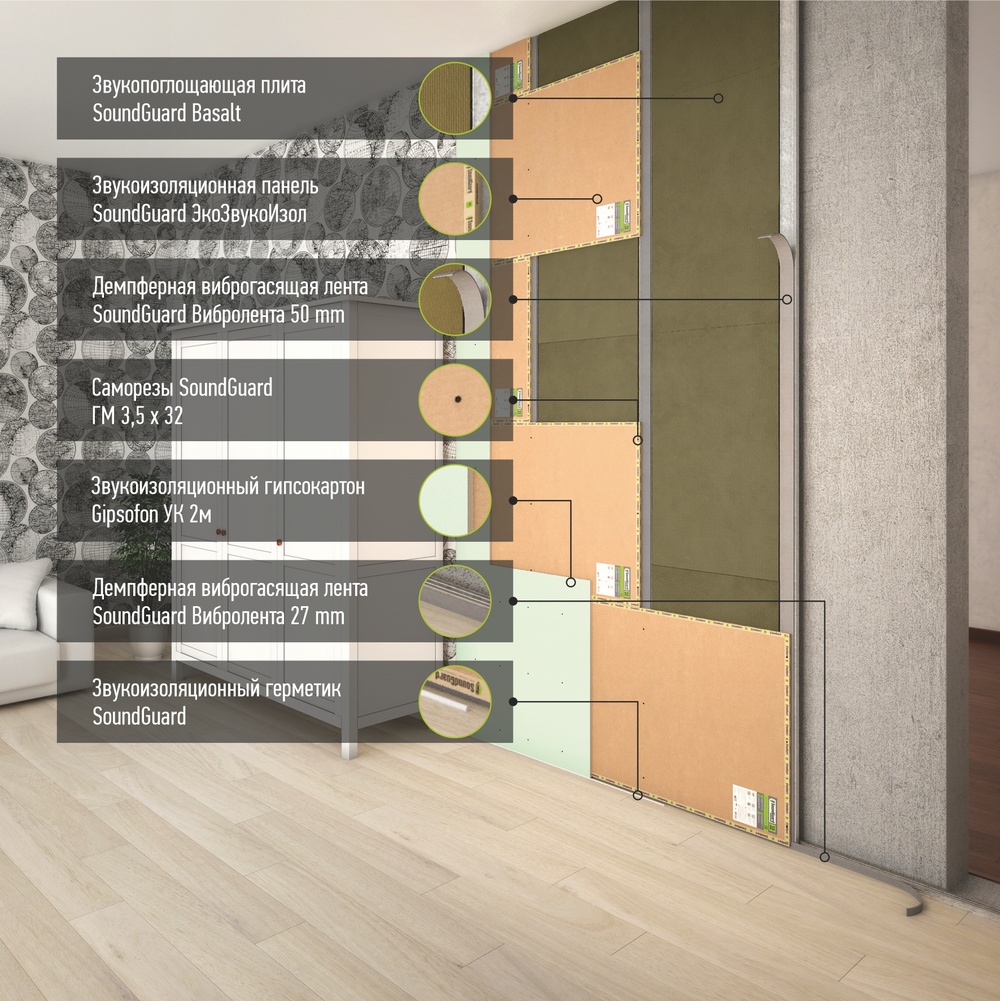 Для звукоизоляции я использовал SoundGuard ЭкоАкустик 80, закрывал листами гипсокартона. Многое нужно учесть, чтобы изоляция реально работала. У меня все получилось. Качество материала отменное!