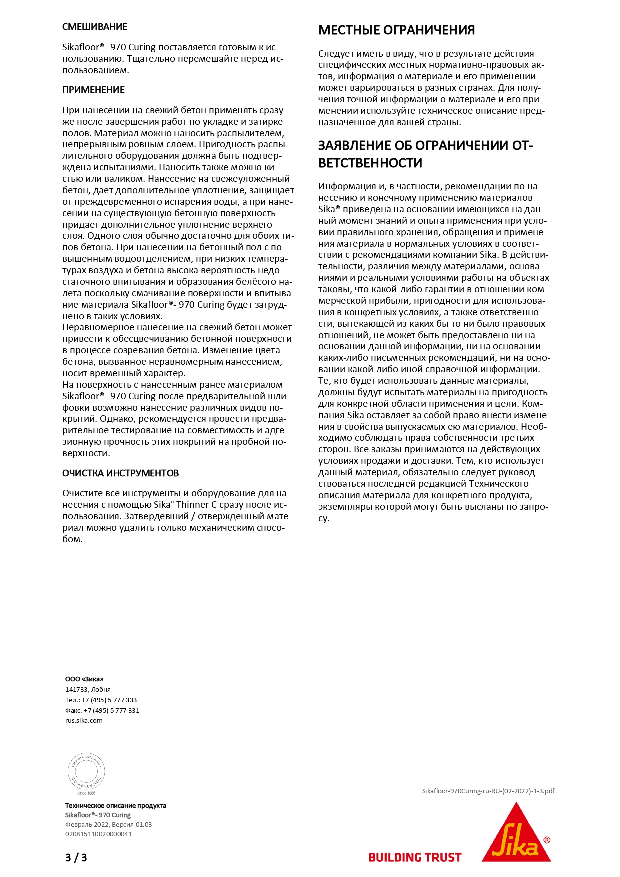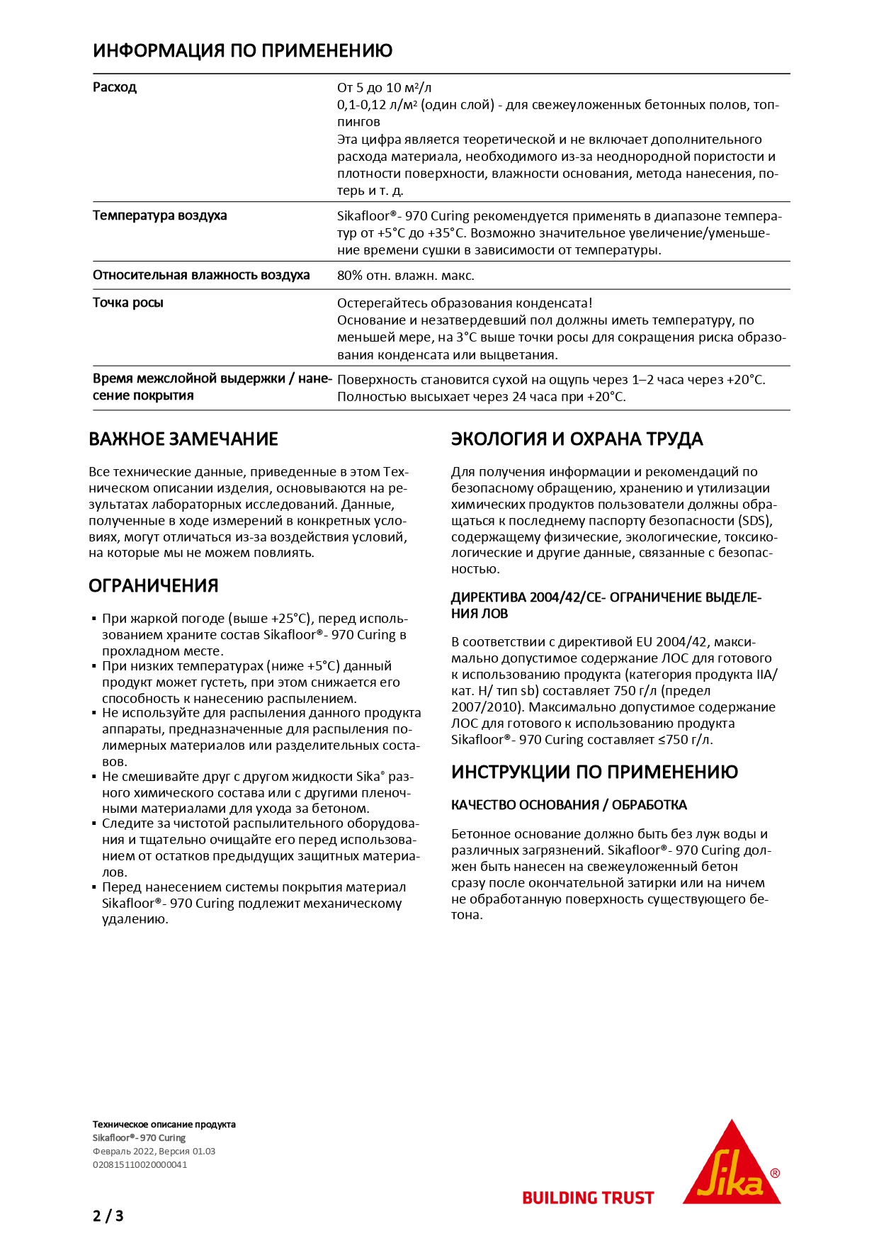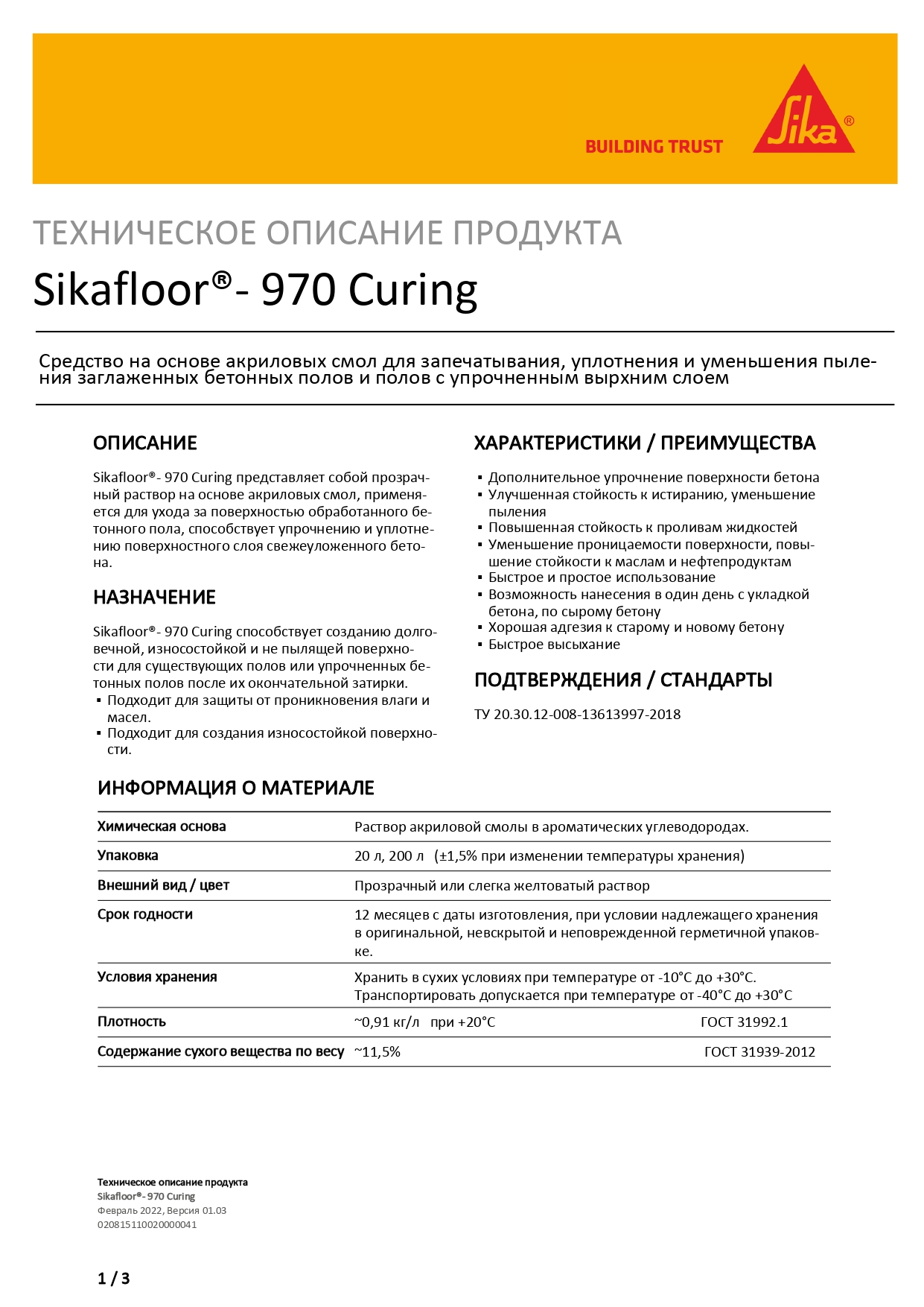 Sikafloor - 970 Curing представляет собой прозрачный раствор на основе акриловых смол, применяется для ухода за поверхностью обработанного бетонного пола, способствует упрочнению и уплотнению поверхностного слоя свежеуложенного бетона.