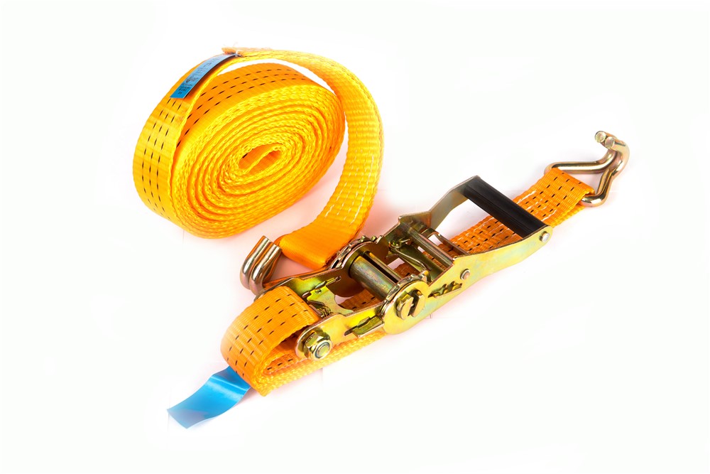 Стяжной ремень двусоставной с крюком и храповым механизмом замком предназначен для стяжки легкого цельного груза (или же его составных частей) для обеспечения целостности при транспортировке, погрузке-разгрузке и хранении. Надёжная стяжка и крепление обеспечивают высокую силу прижатия. В случае непредвиденных ситуаций стяжной ремень освобождает груз за считанные секунды. Это происходит за счёт использования трещоточного механизма с фиксатором. Запас прочности ленты с храповым механизмом на разрыв составляет 2:1. Самого храповика 4:1.