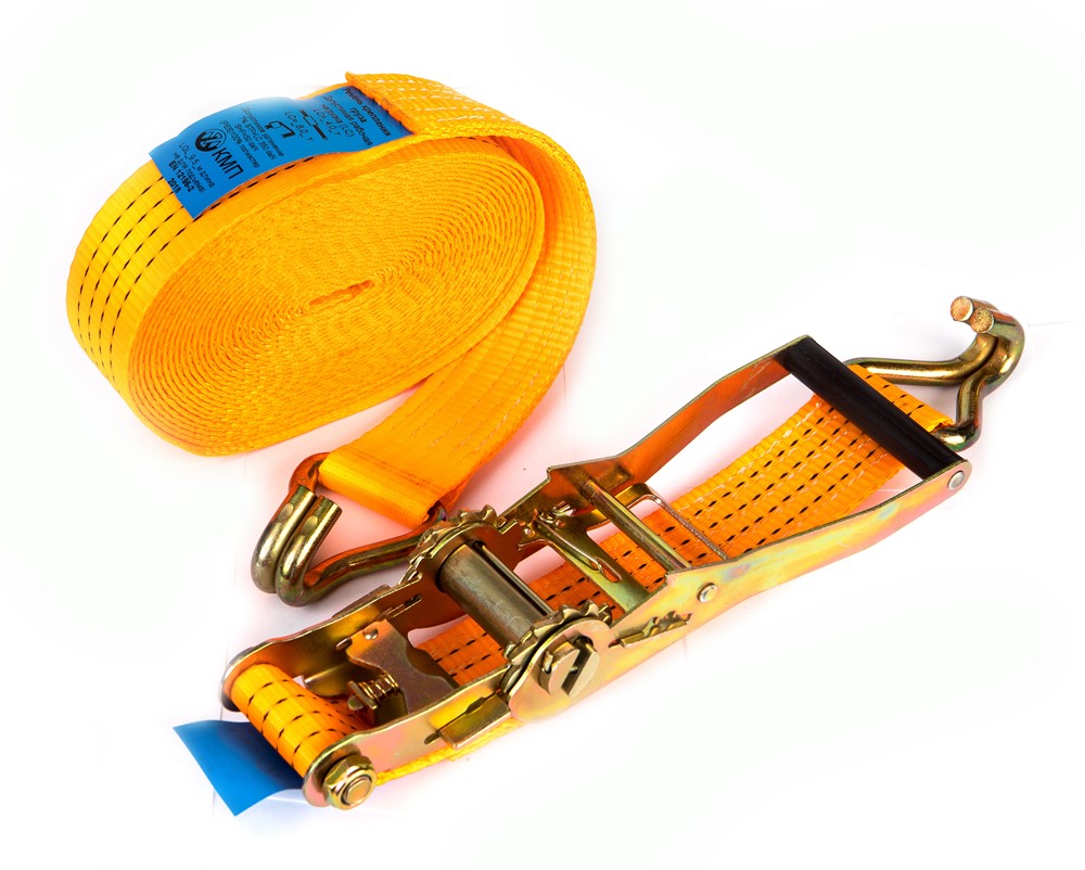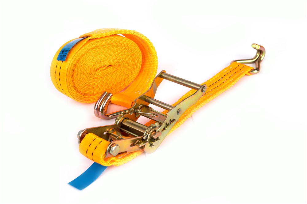 Стяжной ремень двусоставной с крюком и храповым механизмом замком предназначен для стяжки легкого цельного груза (или же его составных частей) для обеспечения целостности при транспортировке, погрузке-разгрузке и хранении. Надёжная стяжка и крепление обеспечивают высокую силу прижатия. В случае непредвиденных ситуаций стяжной ремень освобождает груз за считанные секунды. Это происходит за счёт использования трещоточного механизма с фиксатором. Запас прочности ленты с храповым механизмом на разрыв составляет 2:1. Самого храповика 4:1.