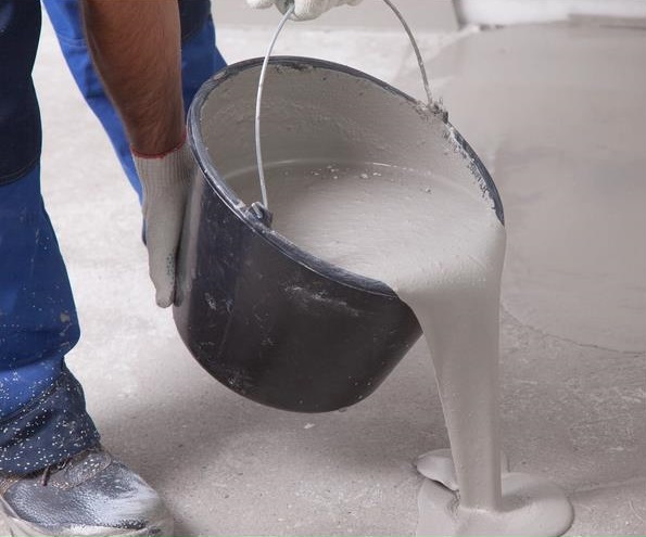 Нанесение раствора необходимо производить от дальнего угла (по отношению к дверному проему), постепенно двигаясь к выходу. Первая порция раствора выливается непосредственно в угол, последующие порции необходимо выливать с частичным наплывом (минимум 2 см) друг на друга. Каждую порцию раствора следует прокатывать игольчатым валиком.
