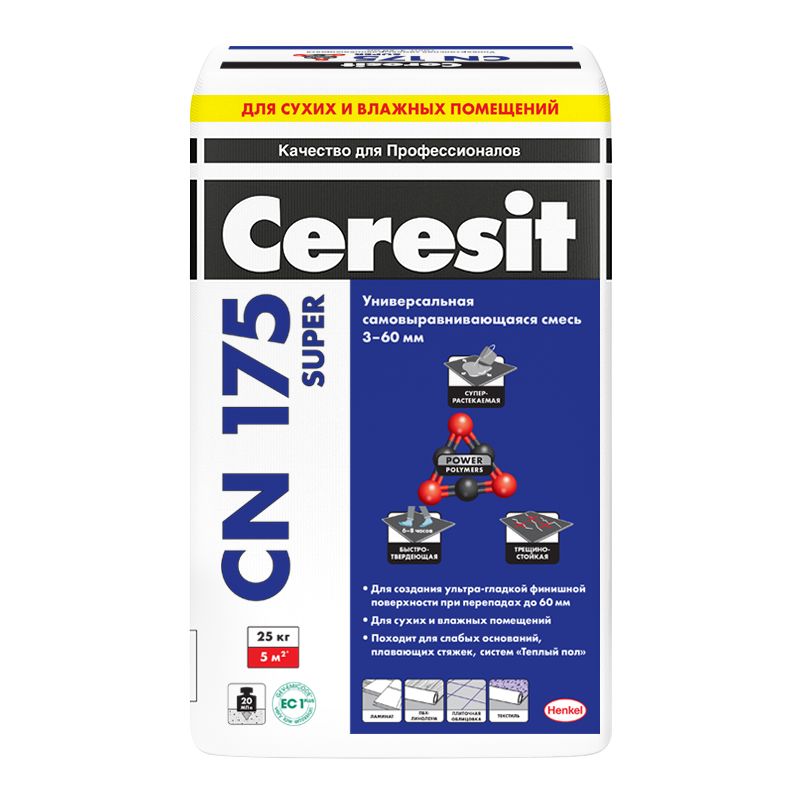 Универсальная самовыравнивающаяся смесь CN 175 Super – смесь из комплексного вяжущего, минеральных заполнителей и модифицирующих добавок, предназначенная для выравнивания оснований пола под укладку керамический плитки, линолеума, ковролина, ламината в сухих помещениях с низкими бытовыми нагрузками (в жилых, бытовых, административных помещениях) ручным и машинным способом. Среди рекомендованных оснований для нанесения смеси CN 175 – бетонные, цементно-песчаные, ангидритные и гипсовые основания пола. Смесь используется для изготовления монолитных стяжек, связанных с основанием, также для стяжек на разделительном слое – толщиной не менее 35 мм, для «плавающих стяжек» на тепло- и звукоизолирующем слое – толщиной не менее 40 мм (при вертикальных нагрузках не выше 2Кн/М2)