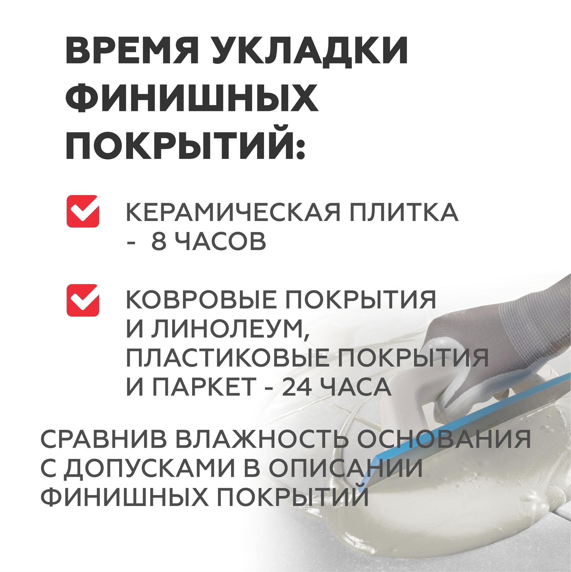 Растворную смесь использовать только в закрытых помещениях.Не подлежит окраске и использованию без напольного покрытия.Передозировка воды не допускается. Хождение по выровненной поверхности допускается не ранее чем через 3-4 часа после укладки. Керамическую плитку можно укладывать через 8 часов. Ламинат и паркет можно укладывать примерно через 24 часа, убедившись, что влажность основания не превышает величину, допустимую инструкцией производителя напольного покрытия .Для оценки уровня влажности основания рекомендуем использовать методы, указанные в инструкции производителем напольного покрытия.