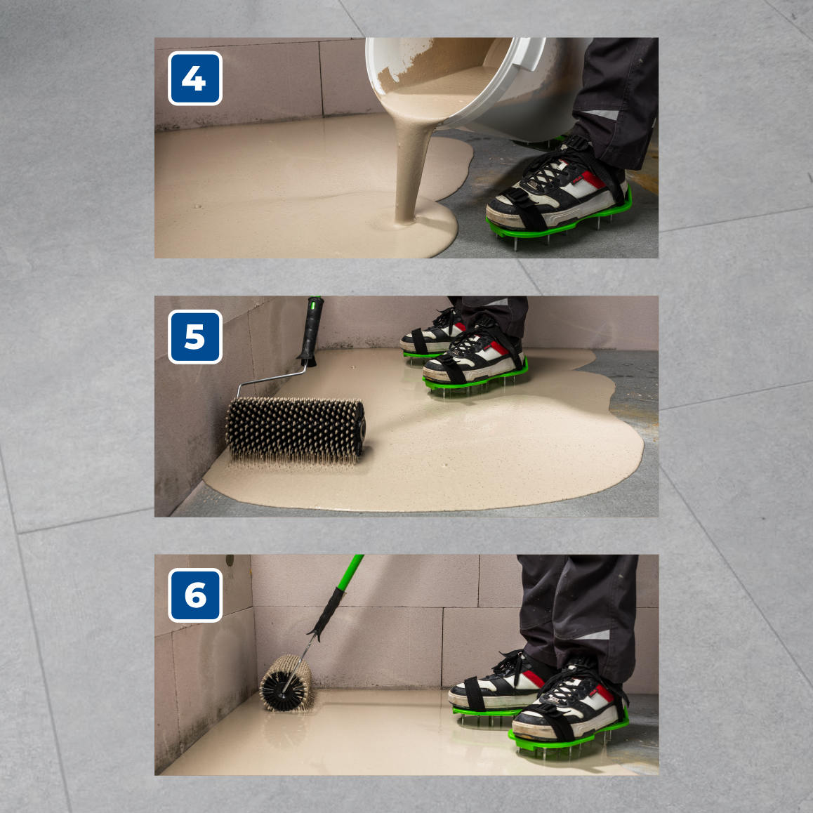 Поверхность основания должна быть тщательно очищена от пыли, грязи, извести, масла, жира, битума, остатков органических и минеральных клеев и красок, а также водорастворимых веществ.Основание должно быть прочным.Обязательно предварительное изолирование выравнивающего слоя пола от стен и перегородок на расстояние 1,5-2 см тонкими полосами пенополистирола или деревянными рейками в полиэтиленовой пленке. Выравниваемую поверхность необходимо обработать грунтовкой.Перед началом работы должны быть готовы две емкости, расходные количества сухой смеси, вскрытые и выставленные в ряд пакеты, вода, мерник для воды. Работу рекомендуется начинать с наиболее отдаленной от выхода стены. Масса ровнителя выливается параллельными полосами к стене шириной около 50 см. Время соединения между двумя порциями не должно превышать 30 минут. Для лучшего распределения выравнивающей массы по поверхности необходимо использовать широкий шпатель или игольчатый валик. Выполнение работ необходимо проводить без перерывов, соблюдая максимальный темп.