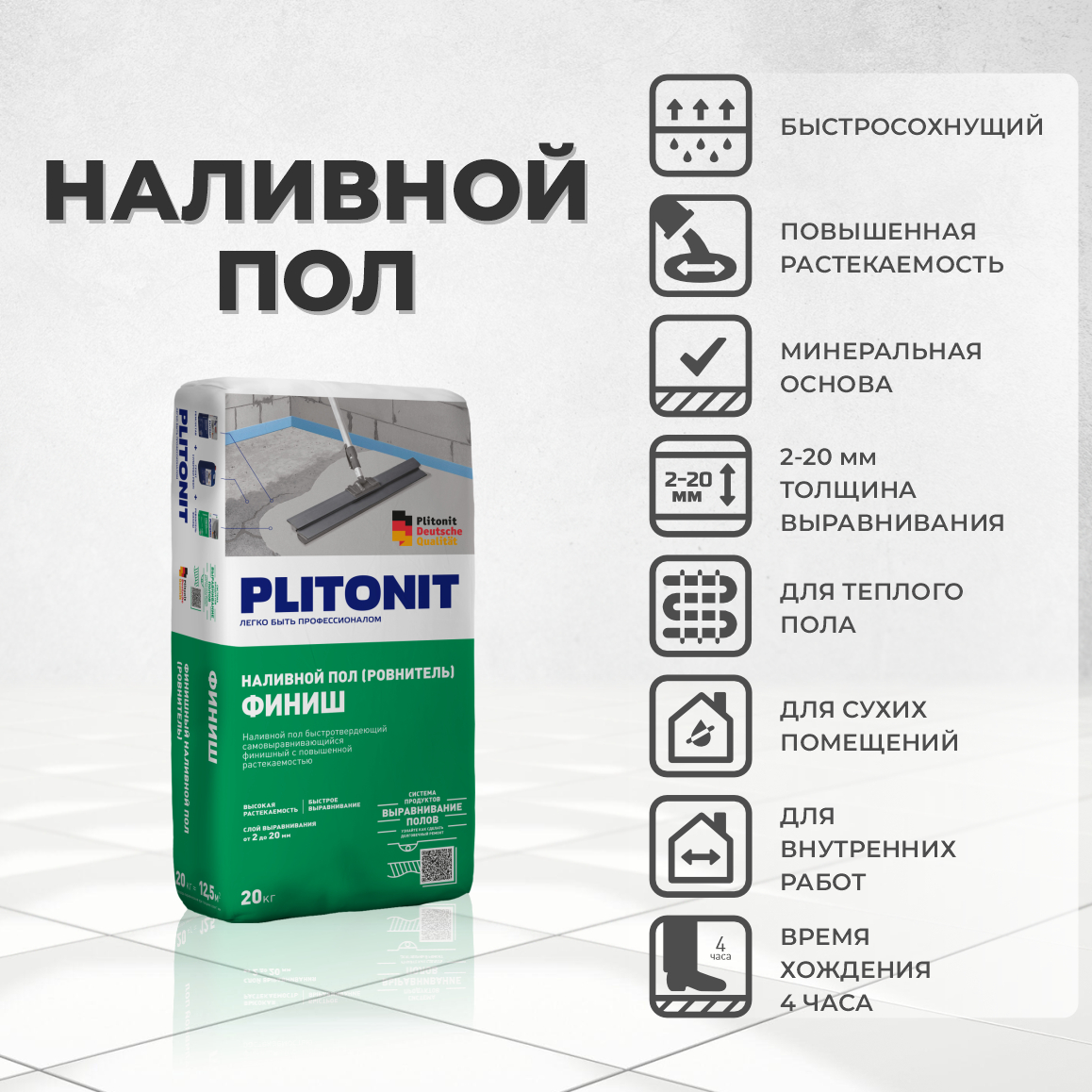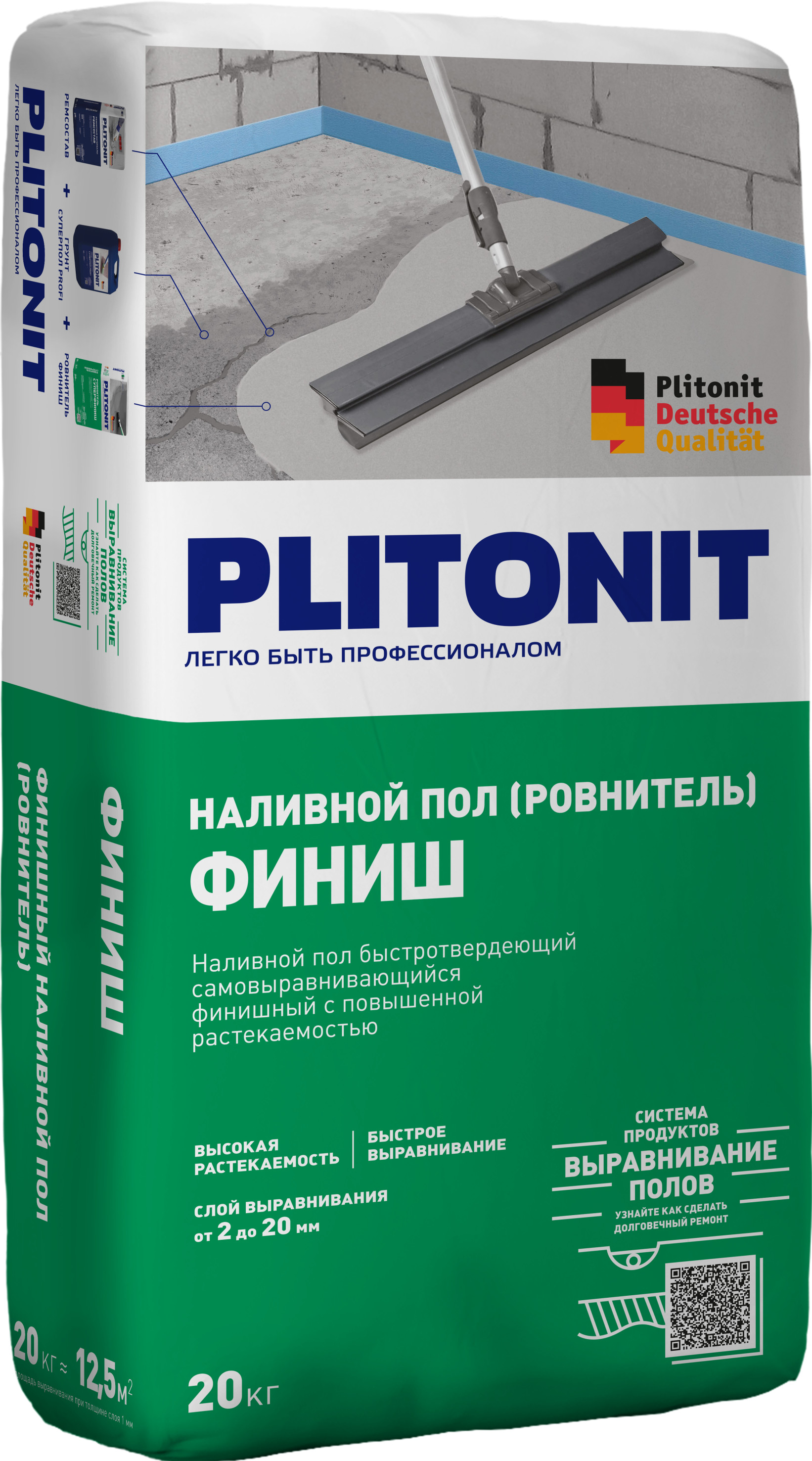Ровнитель Плитонит Финиш быстротвердеющий 20кг - быстротвердеющий самовыравнивающийсяфинишный ровнитель с повышенной растекаемостью. Предназначен для выравнивания и корректирования бетонных полов и монолитных цементных стяжек, внутри жилых и офисных помещений. Используется под укладку плитки, выстилающих покрытий, ламината, в качестве стяжки под паркет и стяжки для теплого пола. Применяется при строительстве и ремонте жилых и общественных зданий и сооружений, в том числе учебно-воспитательных заведениях, детских, дошкольных, школьных и медицинских учреждениях (в т.ч. лечебно-профилактических и санаторно-курортных).