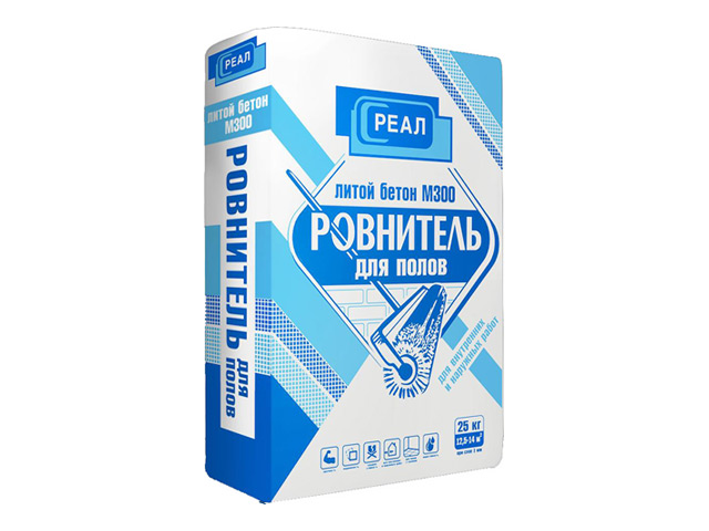 Ровнитель РЕАЛ литой бетон М300 для пола 25кг - предназначен для выравнивания полов, бетонирования лестниц, замоноличивания стыков, ремонта и заделки трещин бетонных полов в жилых и общественных зданиях. Предназначен для использования на горизонтальных поверхностях.