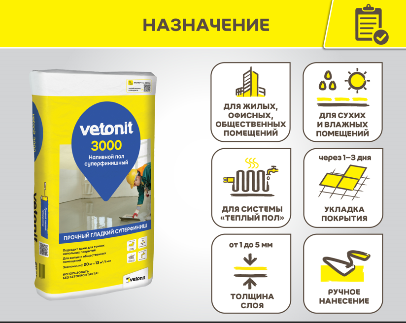Финишный быстротвердеющий ровнитель для пола Ветонит 3000 - самовыравнивающийся ровнитель (наливной пол) на цементной основе. Предназначен для окончательного выравнивания бетонных полов внутри помещений под напольные покрытия.