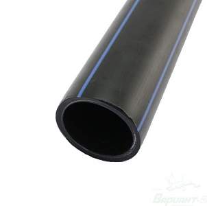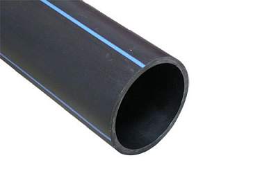 Полиэтиленовые трубы применяются в хозяйственно-питьевой отрасли, также могут быть использованы в канализационных системах и для защиты кабелей. На наружном слое трубы маркером нанесены отличительные полосы синего цвета, означающие, что труба применяется в системах ХВС.