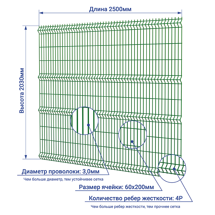 Размер 3D секции для забора с 4 ребрами жесткости – 2030 х 2500 мм, размер ячейки 60х200 мм и диаметр проволоки 3 мм