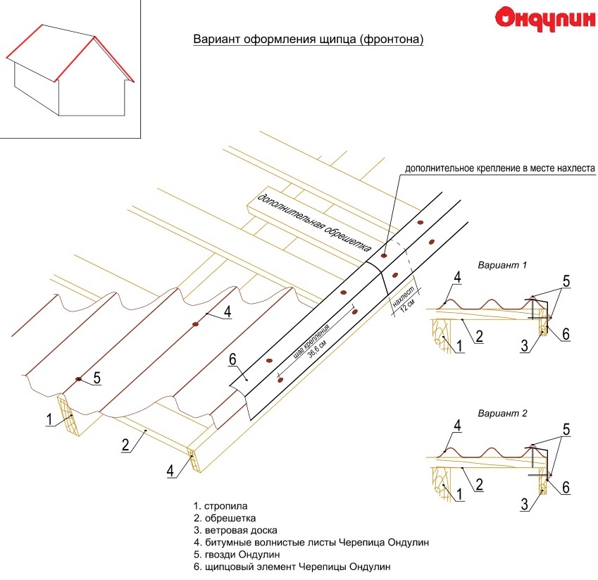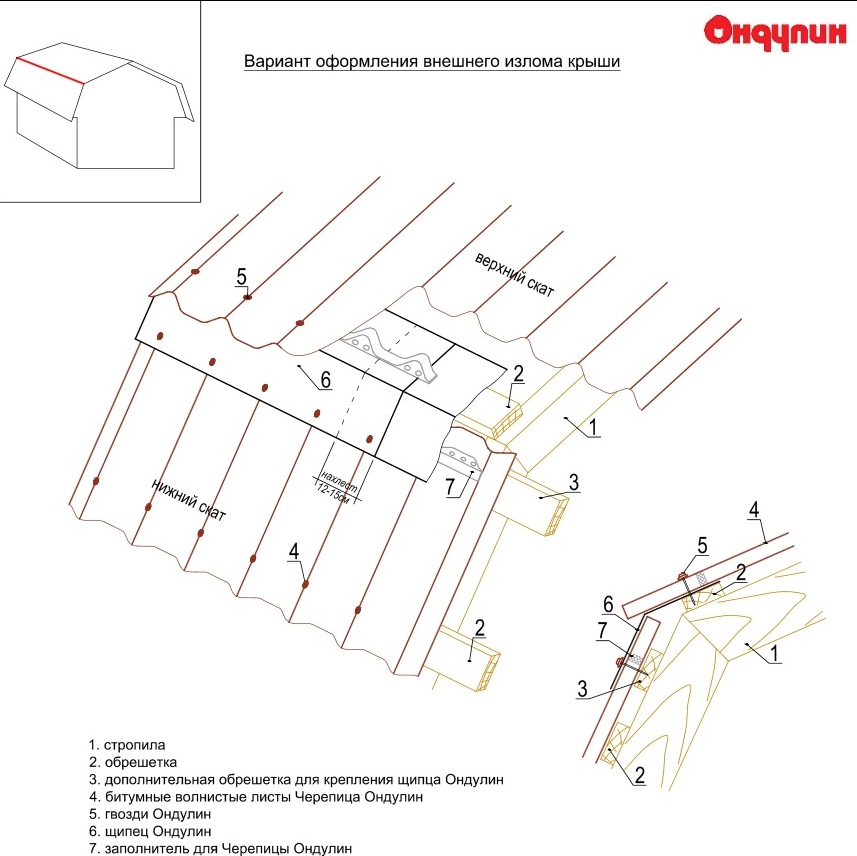 - При использовании щипцового элемента при оформлении внешнего излома кровли, нахлест составляет 10-15см. При этом для закрытия просветов и обеспечения вентиляции можно использовать заполнитель карниза для черепицы Ондулин
