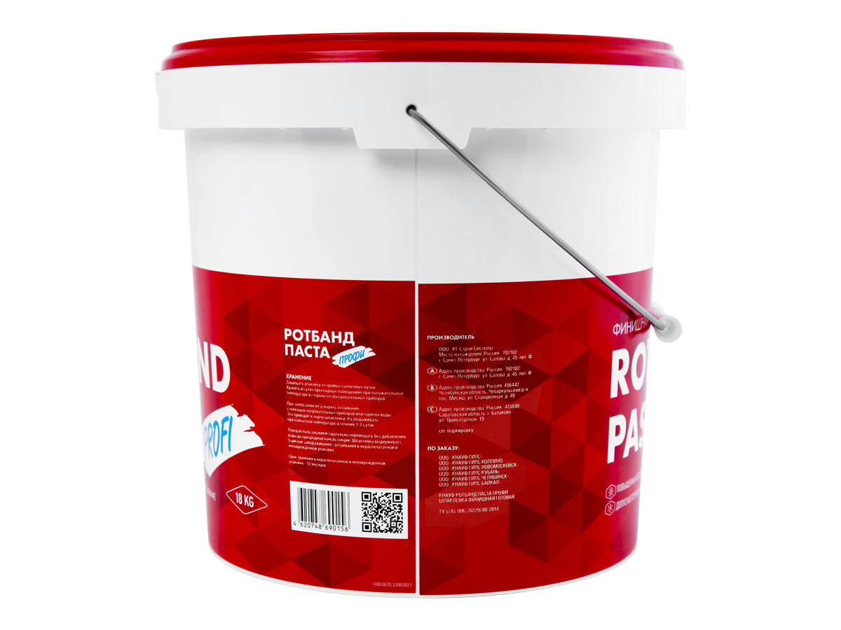 Шпаклевка готовая финишная КНАУФ Ротбанд Паста Профи 18кг - готовая пастообразная финишная шпаклевка на виниловой основе. Обладает повышенной белизной, адгезией и трещиностойкостью. Идеально подходит для тонкослойного (на сдир) шпаклевания поверхности.