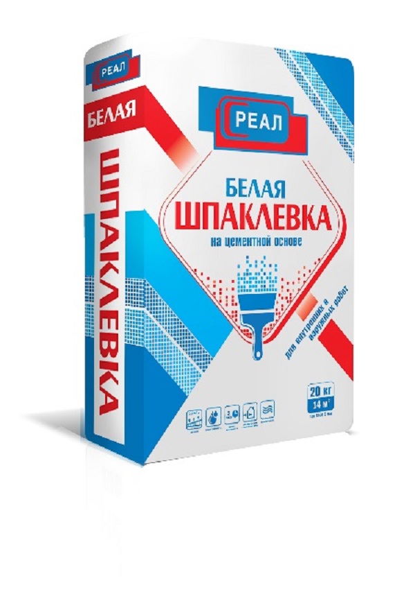 Шпаклевка РЕАЛ Белая цементная - предназначена для финишного выравнивания стен и потолков из бетона, штукатурок на цементной основе в сухих и влажных помещениях, а также при выполнении наружных работ.